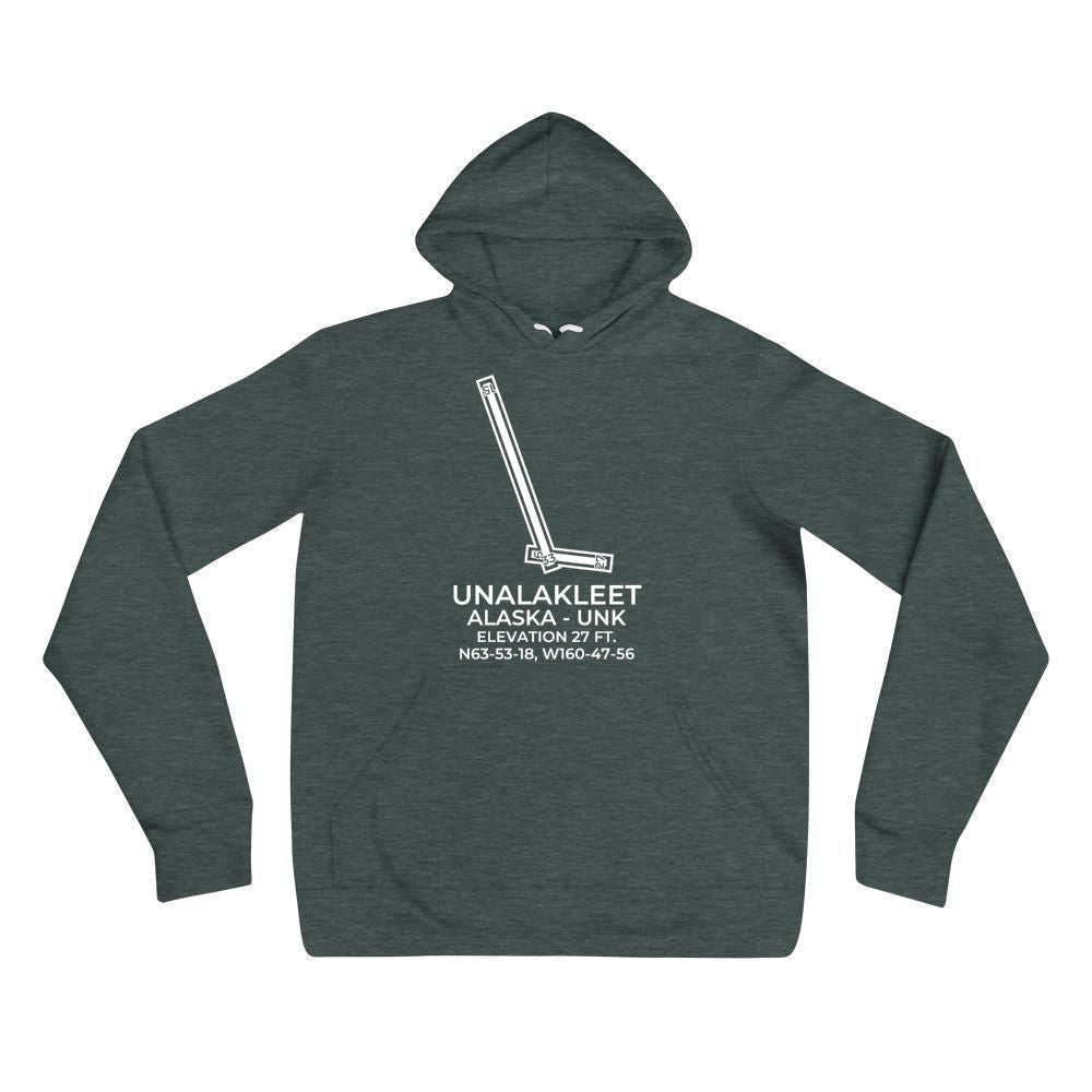 This hoodie depicts UNALAKLEET; ALASKA (UNK; PAUN).