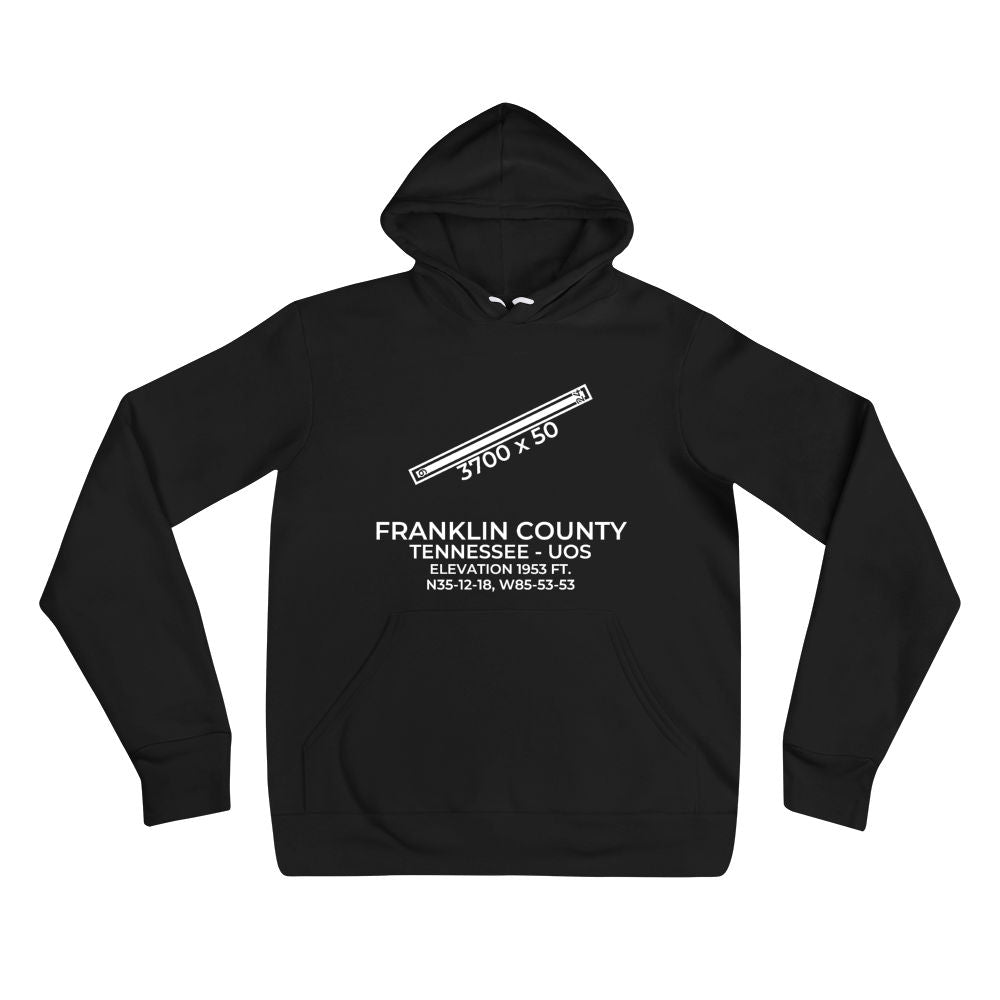 This hoodie depicts FRANKLIN COUNTY in SEWANEE; TENNESSEE (UOS; KUOS).